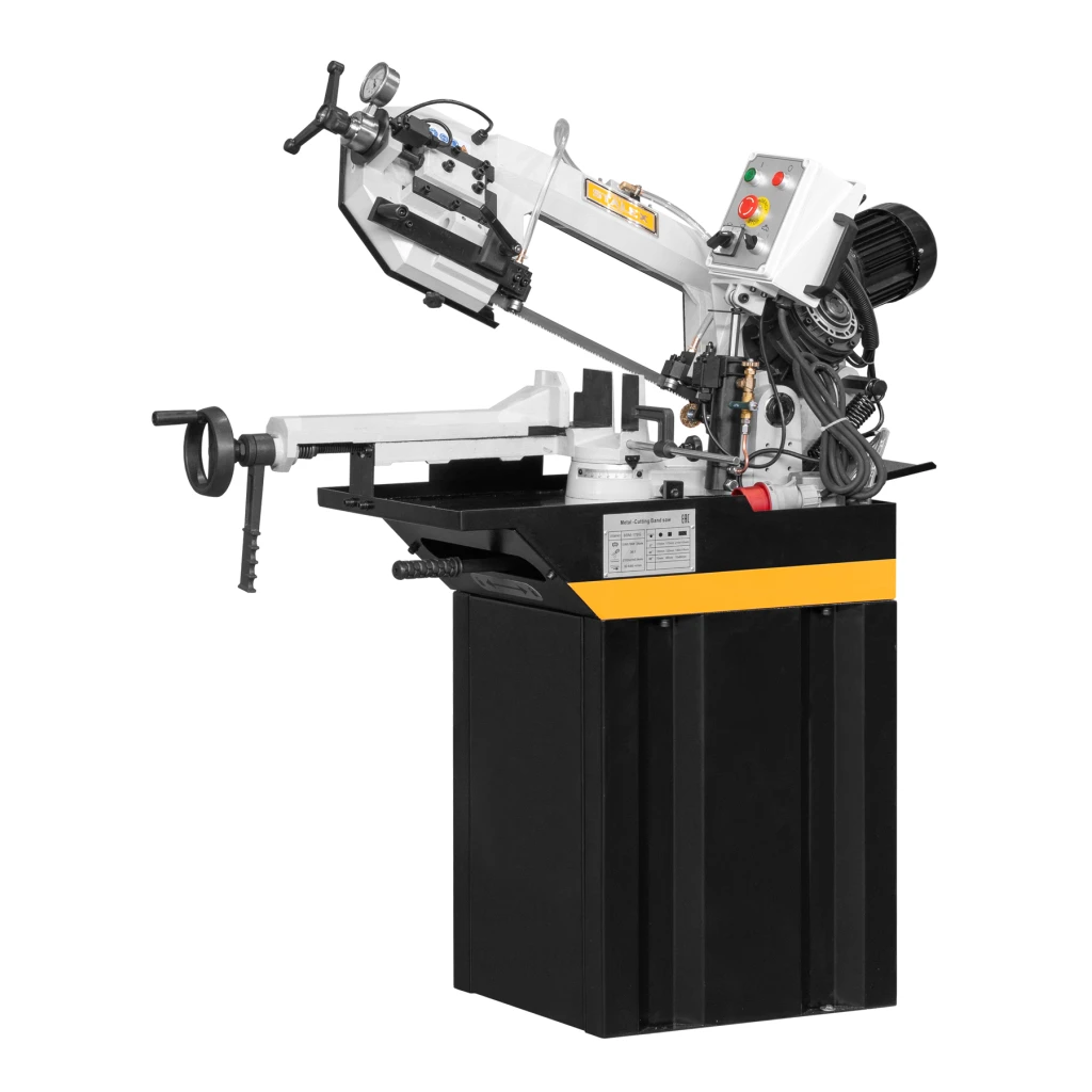 Ручное натяжение ленты, маховик со встроенной шкалой позволяет быстро и легко производить натяжение пильной ленты. Концевики отключающие станок, при поднятии крышек маховика вращения полотна