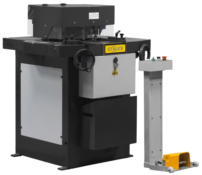 Особенности угловысечного станка Stalex HNM-6A — это мощное оборудование с гидравлическим приводом ножей для вырубки углов от 30° до 140° в листовом металле толщиной до 6 мм. Станок может работать в режиме гильотины и резать листы металла шириной до 200 мм. Процесс резки происходит за счёт работы гидроцилиндра, перемещающего узел по двум направляющим колоннам.